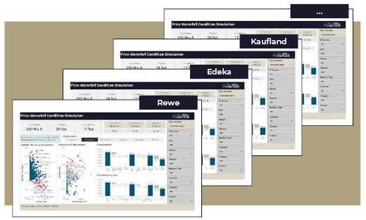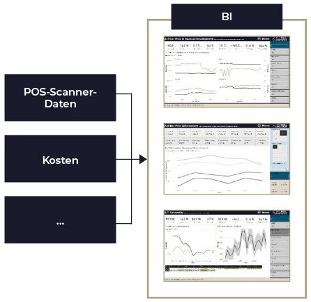 Die Implementierung des Sell-Out-Preismonitorings kann über die automatisierte Verarbeitung von POS-Scanner-Daten in BI-Systeme wie Power BI erfolgen. Dies erfordert keine aufwendige Softwareimplementierung, sondern kann flexibel in bestehende IT-Infrastrukturen integriert werden. Die Basis bilden die Scanner-Daten bekannter Anbieter wie IRI und die direkten Datenlieferungen der Retailer. Die Scanner-Rohdaten zu Preisen werden mithilfe von Datenmodellierung – teilweise unter Zuhilfenahme von künstlicher Intelligenz – in durchschnittliche Sell-Out-Preise übersetzt. Zudem können weitere Datenquellen wie die Daten des eigenen Vertriebs, eigene Kostenstrukturen etc. eingebunden werden.